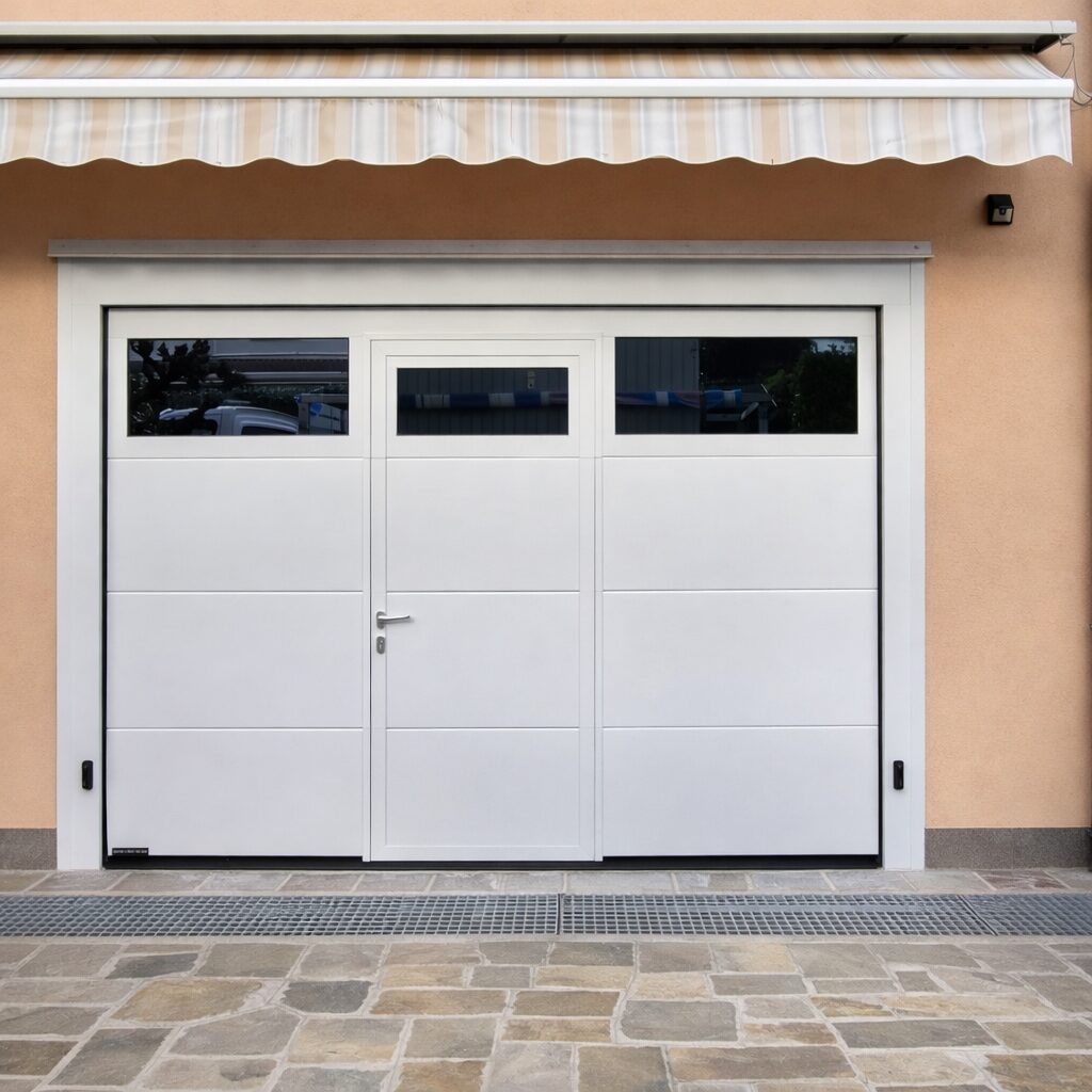 Questo tipo di portone offre diversi vantaggi. Permette un accesso rapido e pratico al garage o al magazzino senza dover sollevare l’intera struttura del portone, il che può essere particolarmente utile in spazi limitati in altezza. Inoltre, l’apertura laterale consente un’entrata e un’uscita pedonale senza dover aprire completamente il portone, rendendo più comode le operazioni quotidiane.